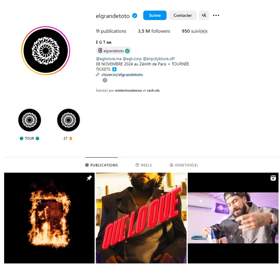 Whose real name is Taha Fahssi, is a Moroccan rapper born on August 3, 1995 in Casablanca. He is one of the most popular artists on the Moroccan rap scene, known for tracks such as "Pablo" and "Mghayer", and his style blends influences from trap, rap and traditional Moroccan music. ElGrandeToto has also gained international recognition, notably in France, thanks to his collaborations with other artists.