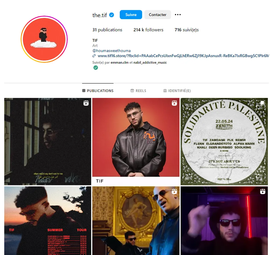 Real name Mohamed Mounir, is an emerging Moroccan rapper known for his unique style and hard-hitting lyrics. Originally from Casablanca, he quickly gained popularity on the Moroccan rap scene thanks to tracks like "Le7sas" and "M3a Lberd". TIF is appreciated for his distinctive flow and his ability to tackle a variety of subjects in his songs. A committed Algerian rapper, he is notably behind the concert in support of Palestine that recently took place on May 22, 2024.